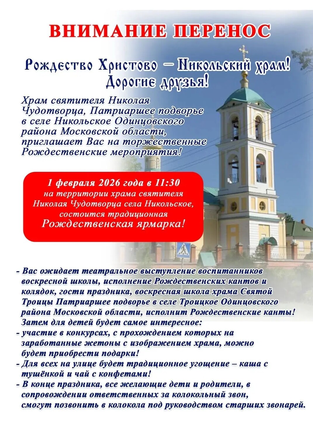 Храм свт. Николая Мирликийского Патриаршее подворье с. Никольское Расписание на февраль - 2026г. |